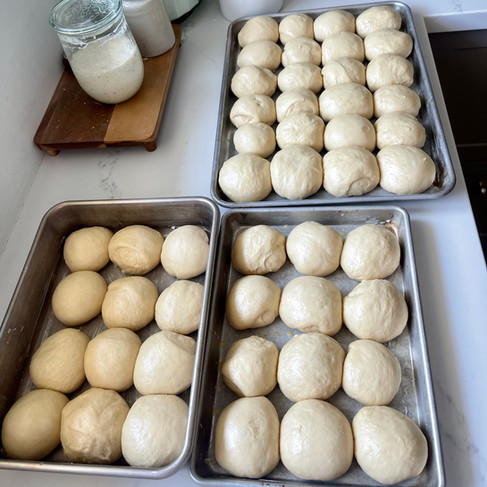 Roll each piece into a ball and place it on a buttered pan with the seam side down. Brush each dough ball with an egg wash (1 egg whisked with about a tablespoon of water). Cover with a lid or plastic and let them rise until they are noticeably larger, the sides and touching and they look puffy. This took my dough about 1 hour.